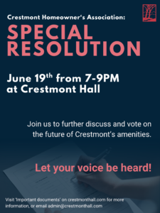 Thank you to all those who attended the Town Hall to discuss the spray park amenity. Please visit the member section of the website for minutes/summary of the meeting and a report from our mechanical services provider. Feel free to reach out to admin@crestmonthall.com if you have any questions.